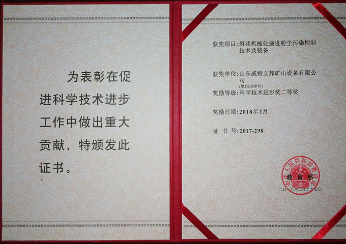 巖巷機械化掘進粉塵污染控制技術及裝備科學技術進步獎